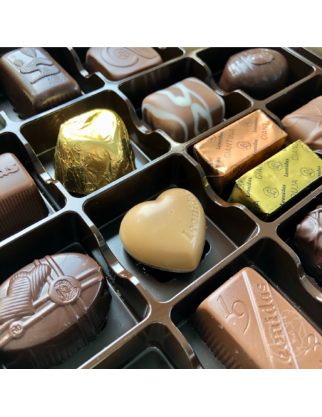 Poids / DLUO Poids net 600gr // DLUO : Min. 45 jours Caractéristiques Contient 40 pièces. Fabriqué à Bruxelles dans le respect des traditions. Garanti 100% pur beurre de cacao et sans huile de palme. Ingrédients Sucre, masse de cacao, beurre de cacao, lait entier en poudre, noisettes, crème de lait, sirop de glucose, beurre (lait), amandes, beurre anhydre, lait condensé sucré, sucre inverti, alcool, humectant (sorbitol), émulsifiant (lécithine de soja), arômes, dextrose, cernaux de noix, sirop de glucose-fructose, fruits confits (orange, melon), sirop de sorbitol, miel, biscuits (blé (gluten), oeufs), riz soufflé, fraise, poudre de cacao, griottes, amandes amères, lait d'amande (amandes, sucre, maltodextrine, fèves de soja, antioxydant (palmitate d'ascorbyle), anti-agglomérant (oxyde de silicium)), invertase, pistaches, café, framboise, conservateur (sorbate de potassium), éclats de fèves de cacao torréfiées, matière grasse laitière anhydre, xylitol, jus de framboise concentré, acidifiant (acide citrique), airelles, sésame, colorant (rouge betterave, extrait de sureau, annatto, curcumine, complexes cuivriques de chlorophylle, caramel), écorce d'orange, amidon de blé, ananas, sel, jus de citron concentré, citron, poudres à lever (bicarbonate de sodium, carbonate d'ammonium), épices, blanc d'oeuf, concentré de fruits, sel de Guérande, pectine, vinaigre balsamique, basilic. Avec chocolat noir (min. 54% de cacao), chocolat au lait (min. 30% de cacao), chocolat blanc (min. 25% de cacao, min. 22% de matière sèche de lait). Valeur nutritionnelle pour 100g : Énergie 2158kJ / 516kcal – Graisses 31g – dont acides gras saturés 14g – Glucides 51g – dont sucres 46g – Fibres alimentaires 3g - Protéines 5g – Sel 0,1gTenir au frais et au sec entre 15°C et 18°C. Fabriqué par Confiserie Leonidas S.A. 43 Boulevard Jules Graindor B-1070 Bruxelles Belgique.