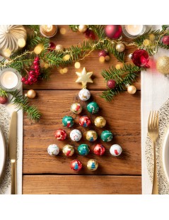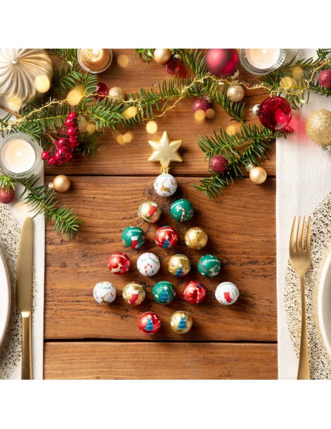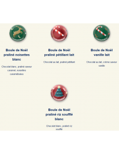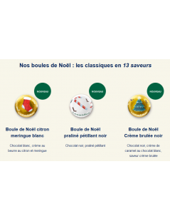 13 variétés mélangées: Noir praliné / Lait caramel salé / Lait praliné pétillant / Lait pâte noisette / Lait praliné biscuit / Blanc praliné riz soufflé / Noir crème brûlée /Lait brownie / Noir Mont Blanc Marron / Noir praliné pétillant / Blanc meringue saveur citron