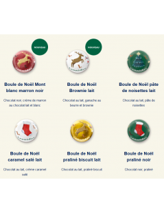 13 variétés mélangées: Noir praliné / Lait caramel salé / Lait praliné pétillant / Lait pâte noisette / Lait praliné biscuit / Blanc praliné riz soufflé / Noir crème brûlée /Lait brownie / Noir Mont Blanc Marron / Noir praliné pétillant / Blanc meringue saveur citron
