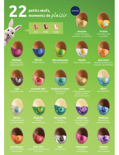 Ingrédients : sucre, masse de cacao, beurre de cacao, LAIT entier en poudre, NOISETTES, crème de LAIT, sirop de cuberdon (sirop de glucose, glucose, arômes, colorants : carmin, charbon végétal), BEURRE anhydre, BEURRE, sirop de glucose, LAIT condensé sucré, émulsifiant : lécithine de SOJA, humectants (sirop de sorbitol, sorbitol), sucre inverti, eau, poudre de caramel avec matière grasse LAITIERE (poudre de lait écrémé, lactosérum en poudre (LAIT), sucre, matière grasse laitière (anhydre, arôme naturel de vanille), citron confit, farine de BLE, café, AMANDES, arômes, farine de riz, dextrose, sirop de glucose-fructose, poudre de cacao maigre, sucre de canne, miel, glycérine végétale, LACTOSE, conservateurs : sorbate de potassium, poudre de cacao alcalinisé, framboises, jus de framboise concentré, sucre caramélisé, acidifiant : acide citrique, invertase, noyaux d’abricots, noyaux d’abricots amers, colorants (rouge betterave, complexes cuivriques de chlorophylle), sel, AMANDES amères, ALBUMINE (ŒUFS), sel de Guérande, jus de citron concentré, poudres à lever (pyrophosphate disodique, bicarbonate de sodium), amidon modifié, dioxyde de carbone, épaississants (agar-agar, pectine), concentrés végétaux (carotte, hibiscus), pectine, extrait de curcumin. Avec du chocolat au LAIT (min.30% de cacao, minimum 22% de matière sèche de LAIT), chocolat noir (min.54% de cacao), chocolat blanc (min. 25% de cacao, min. 22% de matière sèche de LAIT), chocolat blanc au caramel (min.26% de cacao). Contient des traces de FRUITS A COQUES (PISTACHES, NOIX), GLUTEN (ORGE). Valeur nutritionnelle moyenne par 100g : Energie (KJ/Kcal) : 2167 KJ/518 Kcal ; Graisses (g) : 31 ; dont acides gras saturés (g) : 17 ; Glucides (g) : 51 ; dont sucres (g) : 45 ; Fibres alimentaire (g) : 2 ; Protéines (g) : 5 ; Sel (g) : 0.1