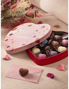 La cœur métal Pralines/Chocolats contient 12 chocolats en forme de cœurs Leonidas croquants, savoureux et fabriqués dans le respect des traditions avec du 100% pur beurre de cacao remplis de notre sélection qui se compose de 7 goûts : vanille, framboise, cerise & sureau, orange sanguine & spiruline (bleu), dulce de leche, blanc praliné et noir de noir. Un éventail de goûts pour vous faire découvrir notre sélection. Chocolat noir, au lait et blanc, praliné, au caramel, à la crème…Une palette de plaisirs intenses préparée par votre Chocolatier Leonidas. Un cadeau qui fera plaisir aux amateurs de chocolat belge.